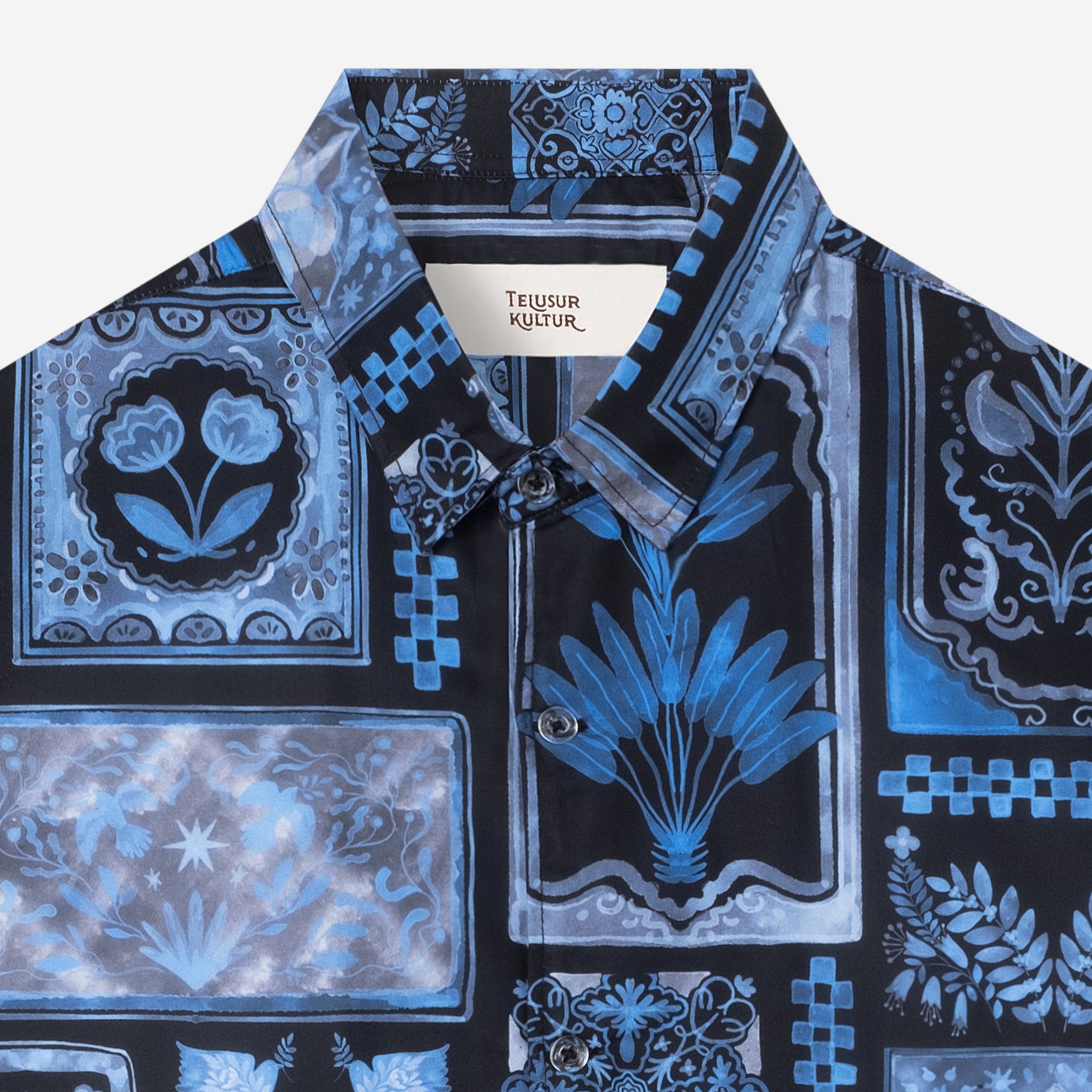 Setiap panel motif pada kemeja ini dirancang menyerupai kolase keramik, ukiran, dan ilustrasi flora-fauna khas kepulauan, mengingatkan kita pada potongan memori dari rumah lama, pasar antik, hingga dekorasi klasik yang akrab dalam keseharian.