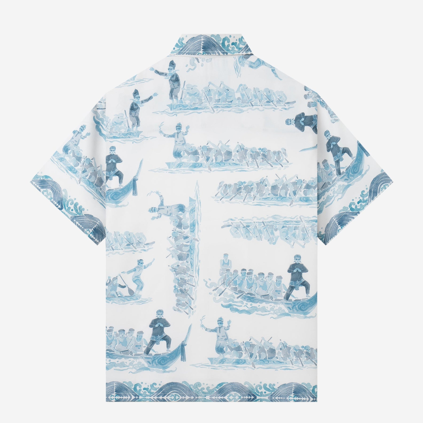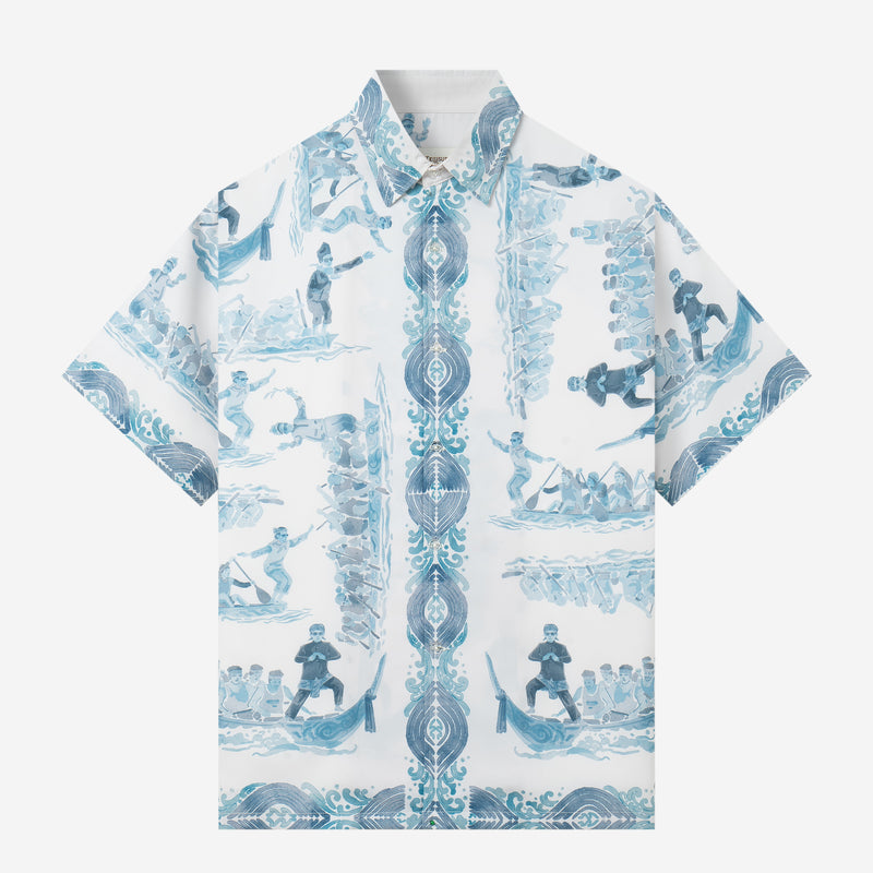 Dibalut dalam nuansa biru air dan putih bersih, kemeja ini menggambarkan momen-momen sakral dalam tradisi Pacu Jalur, mulai dari togak luan hingga irama serempak mendayung.