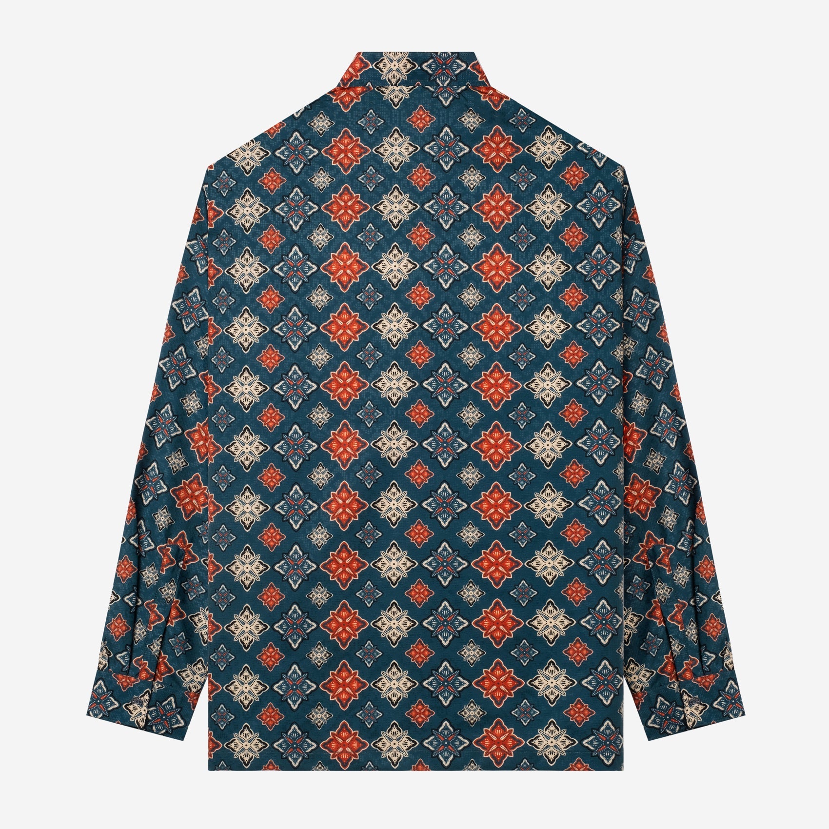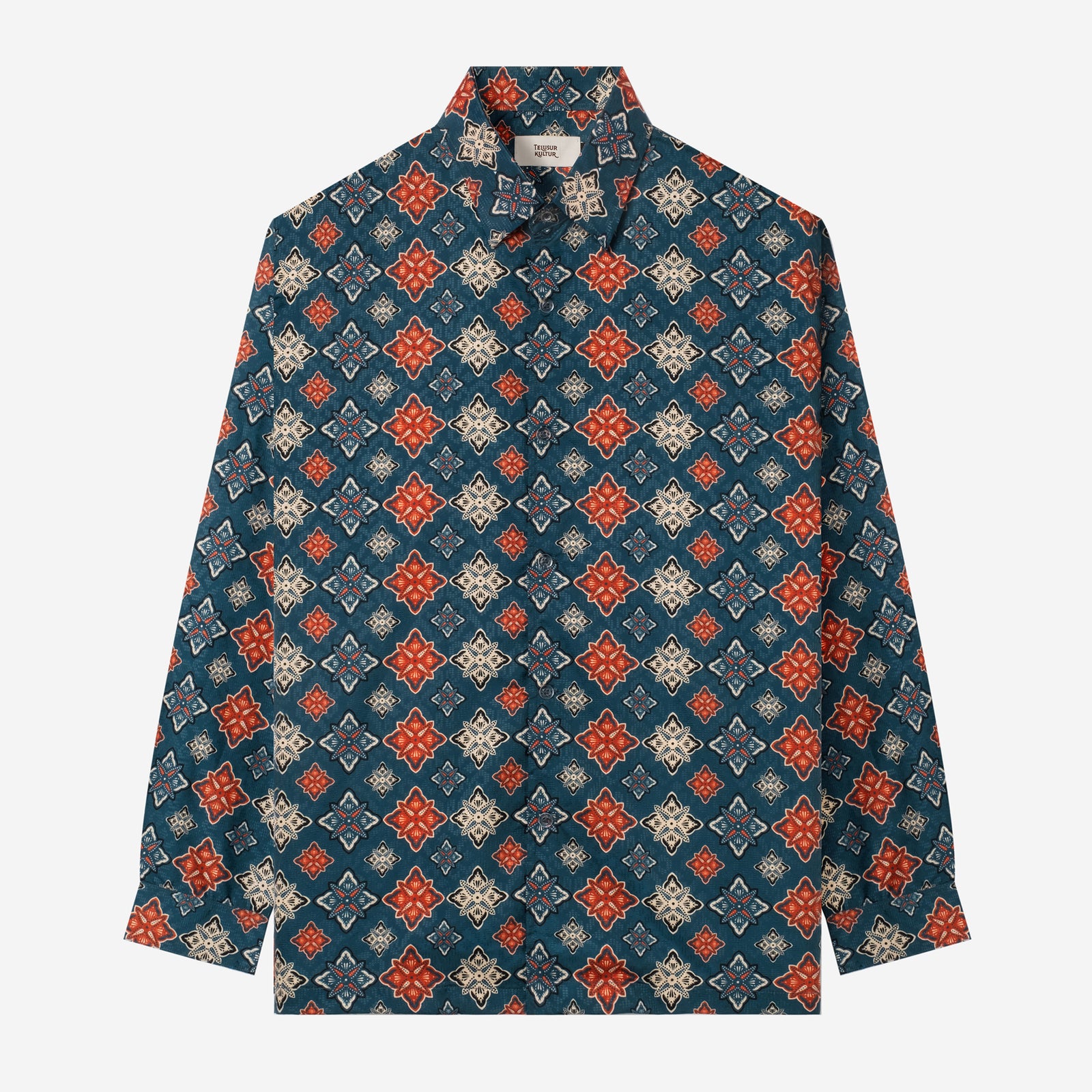 Kemeja Corak Nusantara, terinspirasi dari motif geometris belah ketupat. Motif ini melambangkan keseimbangan dan kemakmuran, serta sering dikaitkan dengan tradisi dan nilai-nilai luhur dalam berbagai budaya di Indonesia.