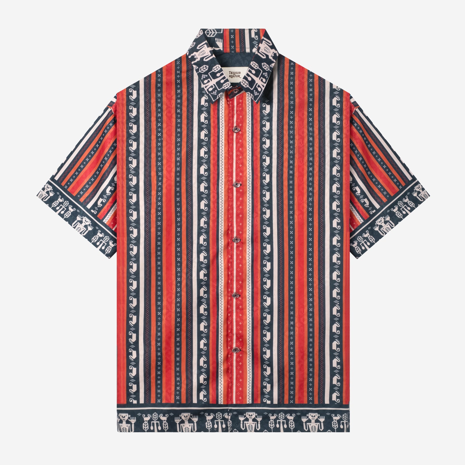 Kemeja Corak Nusantara, terinspirasi dari kekayaan motif tenun Sumba. Motif ini kaya akan simbol figuratif dan geometris yang memiliki makna mendalam, mencerminkan spiritualitas dan status sosial masyarakat Sumba.